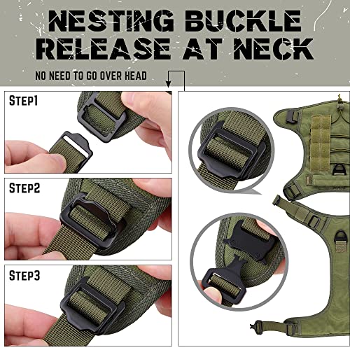 - All Metal Buckles, Release at neck, easy to put on and off. This heavy duty harness has two metal neck nesting buckles that allow you to wear harness more easily. No need to fight dog’s head to slip in the harness. You can put on and take off it directly by releasing the nesting buckles, no need to loosen neck girth every time. All the buckles, including the 3 at chest, are metal to ensure your dog’s maximum safety.